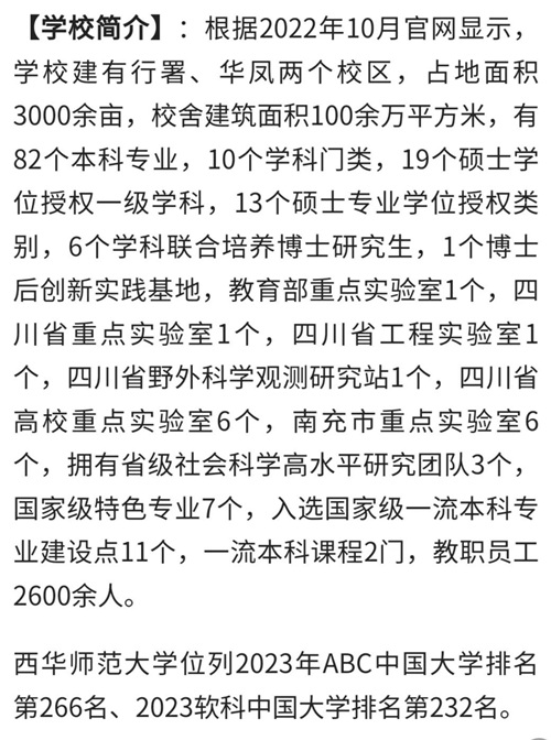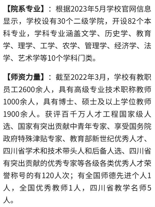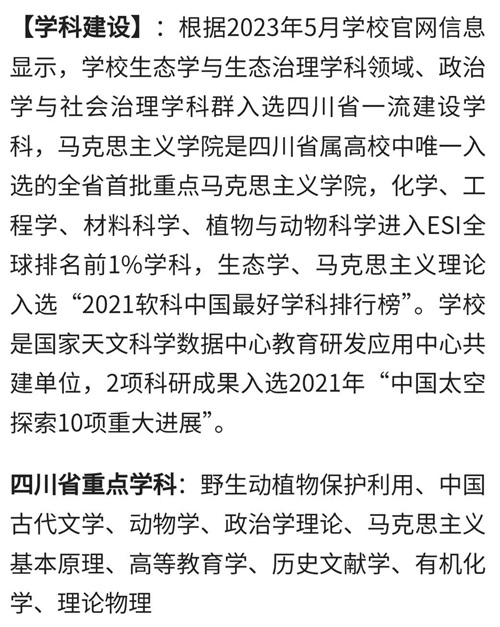 【属性】 :四川省属重点综合性大学,入选国家卓越人才教育培养计划和四川省双一流建设计划、卓越教师培养计划、首批公费师范生培养计划,是国家天文科学数据中心教育研发应用中心共建单位,被誉为“读书的好地方、选才的好去处”。