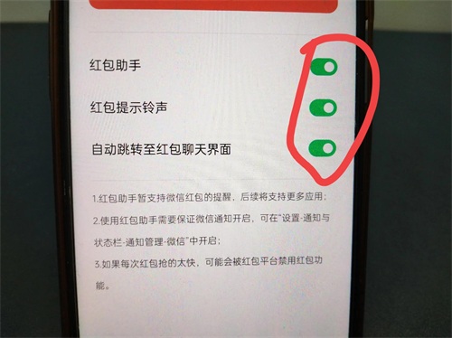 它是如何设置的呢?首先,需要打开红包助手;其次,打开红包提示铃声,方便红包来时有提示音提醒我们领取;再者,要把自动跳转至红包聊天页面的开关打开。打开这三个开关,就能不错过任何红包。(如上图所示)