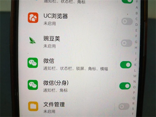 在这里可以看到“应用通知”,找到微信。微信打开后,一定要把这个开关打开,红包就能在通知栏、状态栏、锁屏角标、横幅显示出来,如此才能检测到。(如上图所示)