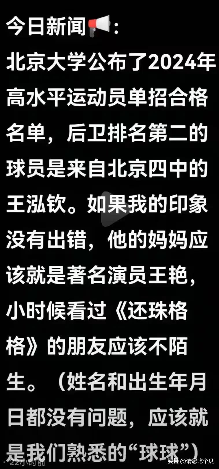 下图是北京大学发布的保送生名单,王艳的儿子王泓钦,是北大男篮2024年的运动队后卫,他是通过“体育生”而保送到了北大。当年,奶茶妹妹章泽天也是通过“体育生”保送到了清华大学。