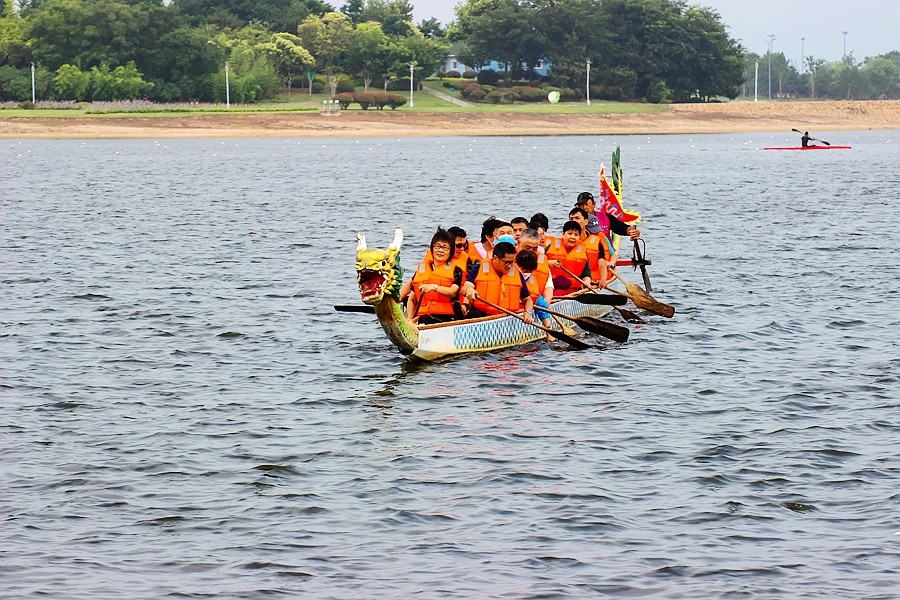 在海上体验划龙舟,虽然有点累,但大家都玩得很开心。