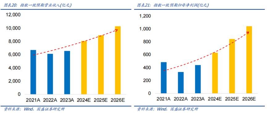 中证人工智能主题指数的盈利能力突出,预期指数未来盈利高速增长。从指数的万得一致预期来看,中证人工智能主题指数2024、2025、2026年预期营业收入分别为8018、8894、10260亿元,同比增速分别为22.89%、10.92%、15.37%;预期2024、2025、2026年归母净利润分别为627、840、1037亿元,同比增速分别为43.75%、33.87%、23.55%。因此,中证人工智能主题指数的盈利能力突出,预期指数未来营收与归母净利润的增速较高,成长性可期。