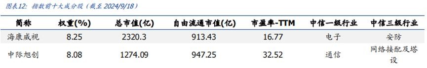 中证人工智能主题指数重仓股紧扣AI主题,科技龙头属性高。从指数前十大成分股来看,截至2024年9月18日,指数前十大权重累计占比53.57%,集中度较高,主要聚焦于AI相关产业的科技龙头。例如指数前三大成分股分别为安防行业龙头股海康威视、网络接配及塔设龙头股中际旭创、集成电路龙头股韦尔股份。