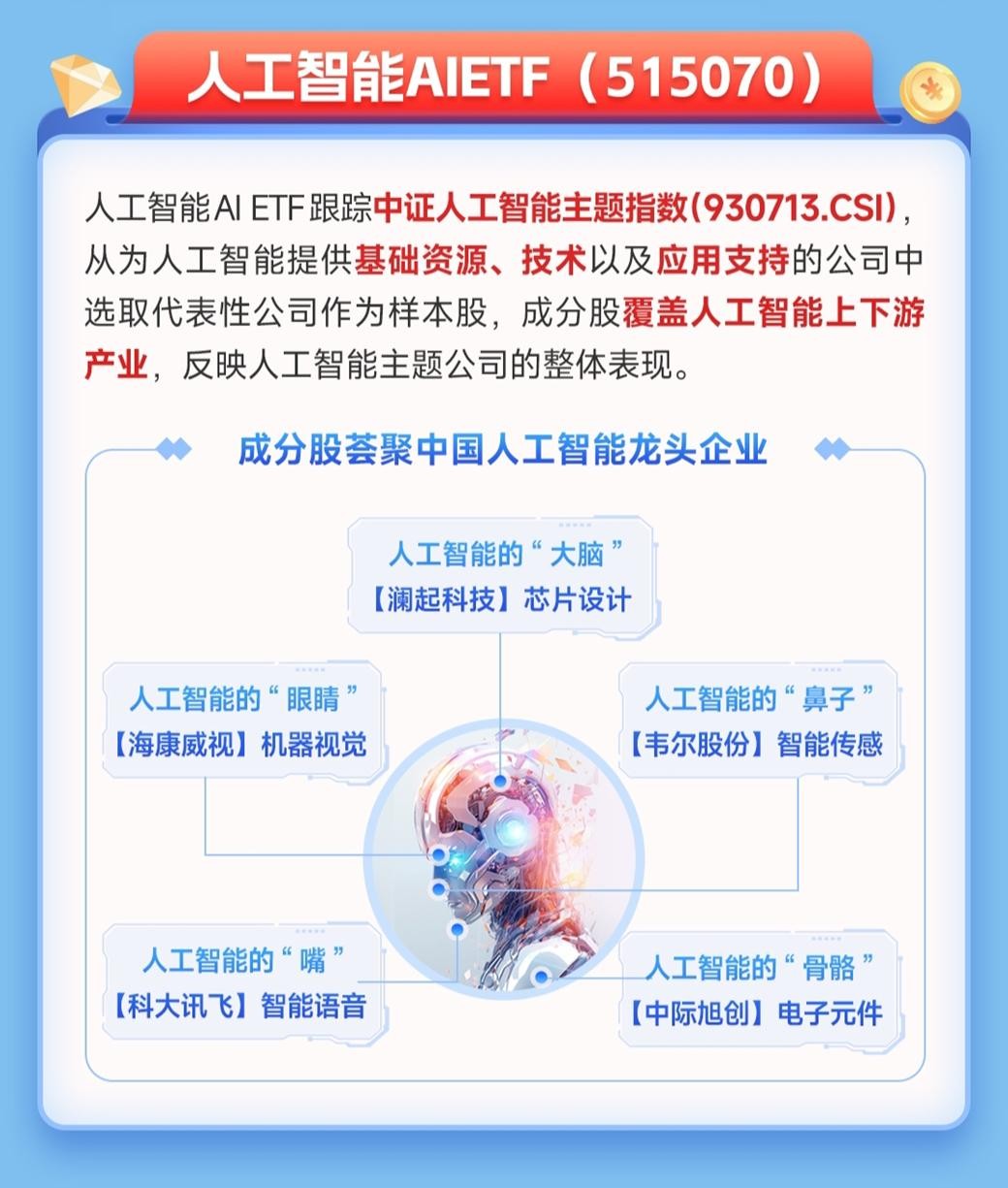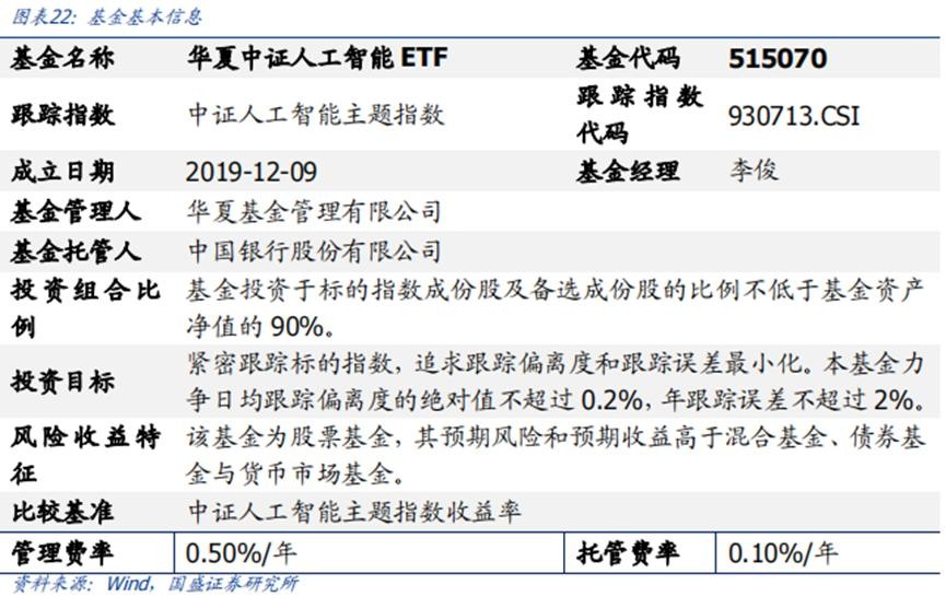 华夏中证人工智能ETF(简称:人工智能AIETF,基金代码:515070)。基金成立于2019年12月9日,基金投资目标是紧密跟踪标的指数,追求跟踪偏离度和跟踪误差最小化。本基金力争日均跟踪偏离度的绝对值不超过0.2%,年跟踪误差不超过2%。