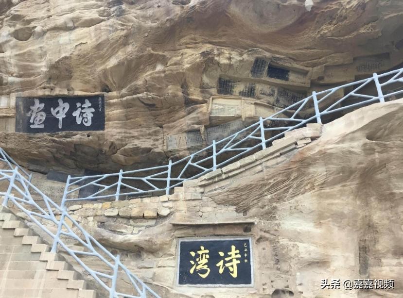 诗湾:位于弥勒洞上方。《延安府志》云:“清凉山阿,多名人题咏石刻,参差磊落,里人呼为诗湾。”清延安知府张伟咏之:“层层高阁倚星辰,诗壁留题时代新。长羡范韩名不休,风流继起更何人。”现有历代摩崖题刻50余处,其中明清以前的刻制尚能辩认的还有十余块。现代中国著名人士及日本友人的题刻,真草篆隶,布满山崖。