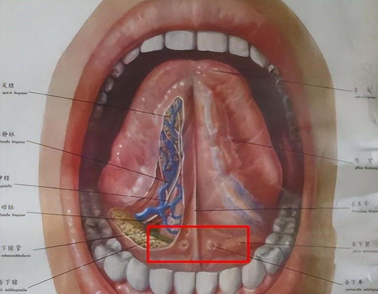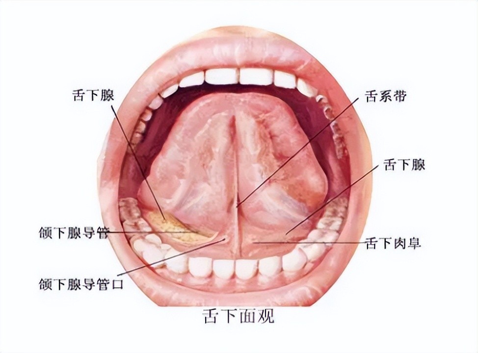 而在舌下带的两侧黏膜上各有一个小突起,看起来像小肉芽,但它们其实是下颌下腺管和舌下腺管的共同开口,称为舌下肉阜,属于正常的生理结构。
