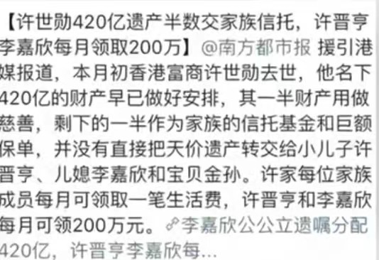 可许老爷子早就安排好,在去世前便将420亿家产存到了信托基金中,而许晋亨与李嘉欣只能每个月从中领取200万生活费。此消息被曝光后,李嘉欣前半生的算计筹谋,全都沦为了笑话。