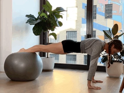 双膝跪地,双手扶住瑜伽球呼气,收紧核心,身体重心向前双手推着瑜伽球向前,手肘压球吸气,还原,重复练习10-15次