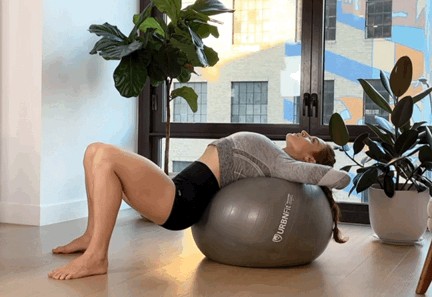 双腿屈膝踩地,上半身仰卧在瑜伽球双手放后脑勺,呼气,收核心,卷尾骨臀部、腰椎逐节离开瑜伽球吸气,还原,重复练习10-15次