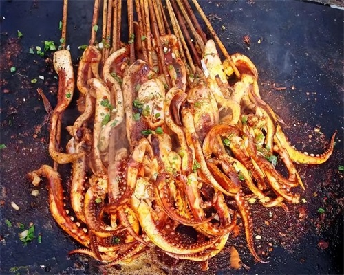 你只需要将鱿鱼须串在签子上,放到滚烫的铁板中烤制,被烤的焦黄的鱿鱼丝包裹着大量的油脂,再撒上辣椒粉、孜然粉、芝麻等配料,鲜香麻辣,十分开胃,每套装卖15或20元,一天至少能挣2000元。