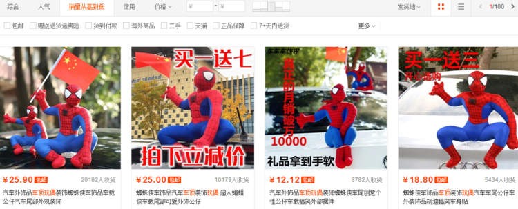 这些玩偶是哪里来的呢?周到君在淘宝网上搜索发现,售卖此类玩偶的店铺非常多,而且销量一直居高不下,销量最高的店铺当月销量已达到36000多件!而且选择也颇多:蜘蛛侠、蜡笔小新、蝙蝠侠、小黄鸭……价格从25元-48元,使用也非常简单,先将底座粘在车顶,然后将玩偶安装在车顶上即可。