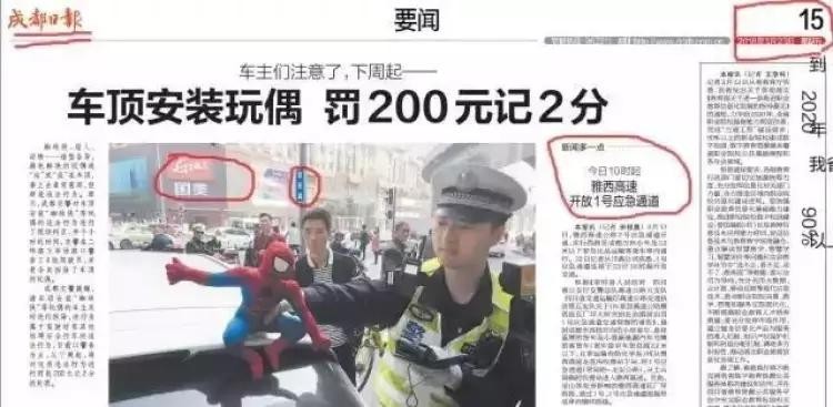 近日,周到君的微信群里流传着这么一条消息,“车顶安装玩偶 罚200元记2分”。之后网上一查,果然连报纸都登载出来啦!具体信息如下:从下周一(3月26日)开始,成都将按照《道路交通安全法》等相关法规,对此类在驾车过程中有会妨碍安全行车的违法行为,进行罚款200元记2分的处罚。