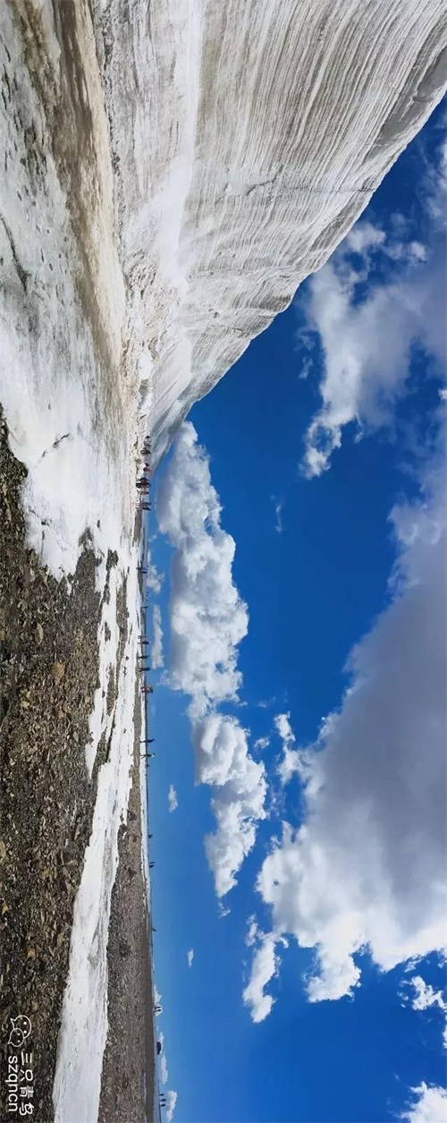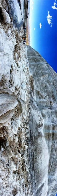 满目极简的蓝、白、褐三色,冰川如巨大城堡横卧眼前,我被壮观景象震撼,感叹于自然天工,忘却了此处已是4800多米的海拔。白云轻吻着冰川,仿佛伸手就能抓住,蔚蓝天空让人赏心悦目。冰壁透着年轮,不知多少万年才能形成?