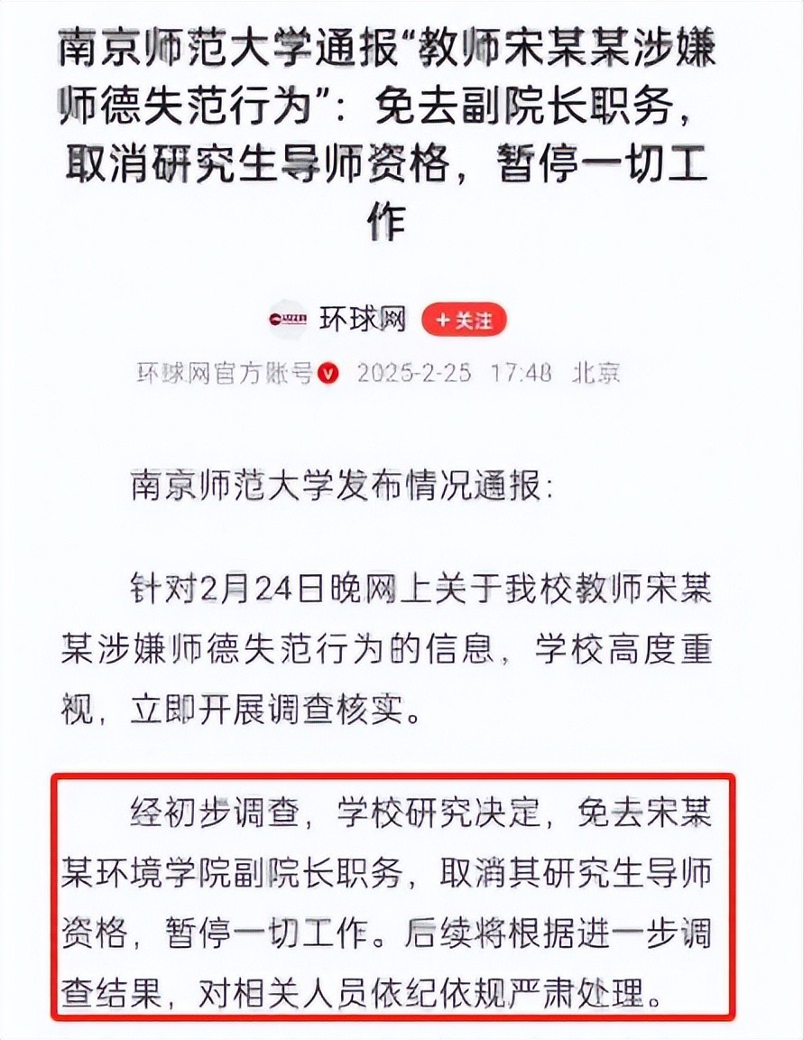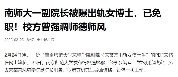 2025-02-25 18:47 南方都市报 南师大一副院长被曝出轨女博士,已免职!校方曾强调师德师风