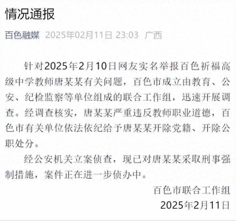 如果说前三个事情,都是当事人道德素质的败坏,那么百色一高中的教师唐某某,已经是突破了法律的红线。