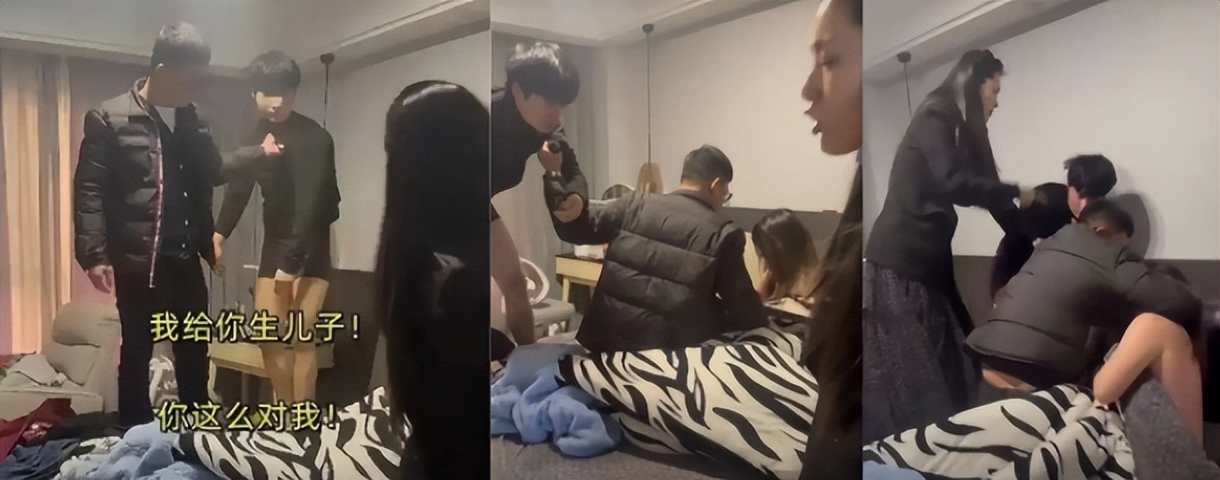 出轨男原配气冲冲的上前,对着床上的男女就是一顿毒打,同时她还质问出轨男,自己给他生儿子,结果就这样对待自己?