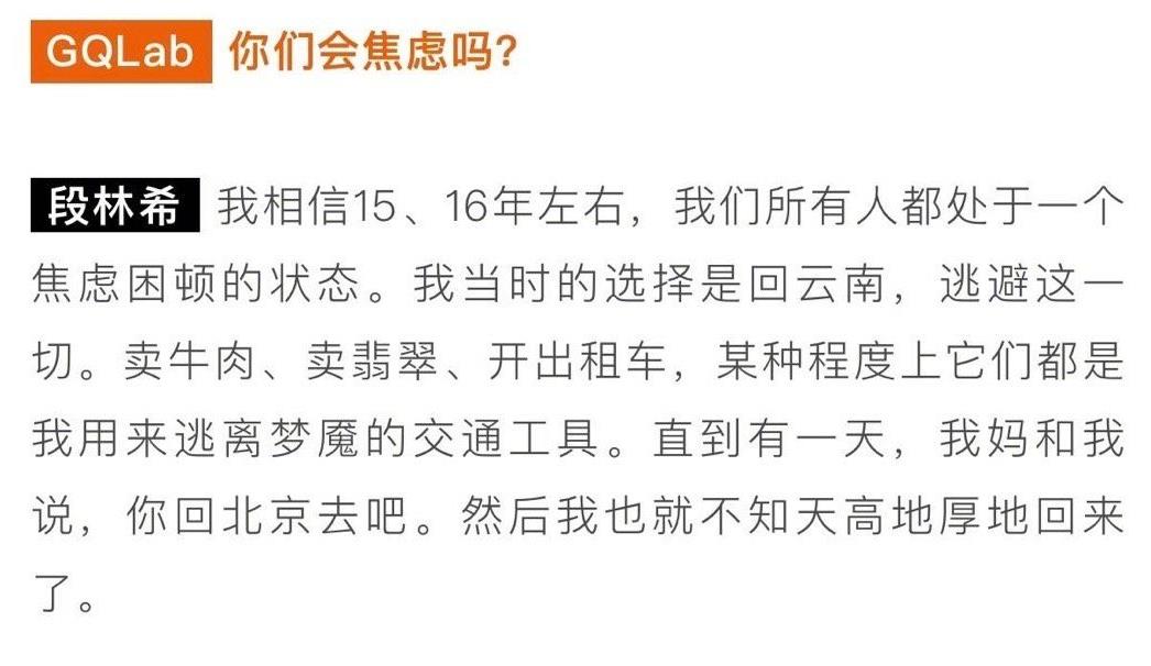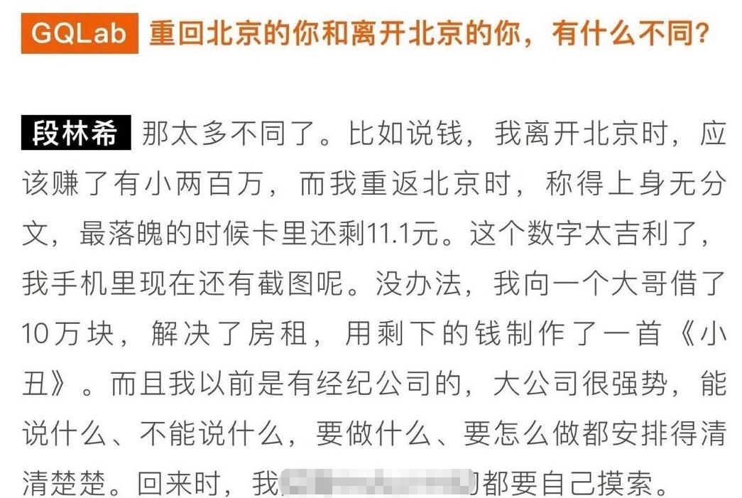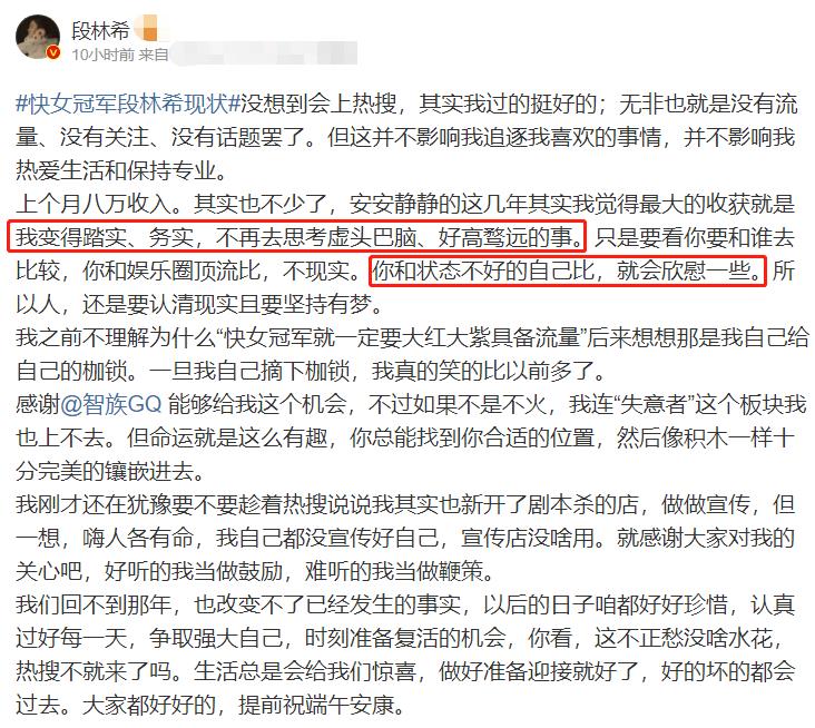 这篇采访稿发布不久,段林希便在社交平台发布小作文,一五一十地回应了自己当今的心境。她表示自己现在非常踏实、务实,不会去考虑好高骛远的事,还乐观的称,和过去状态不好的自己相比,如今已经很欣慰了。