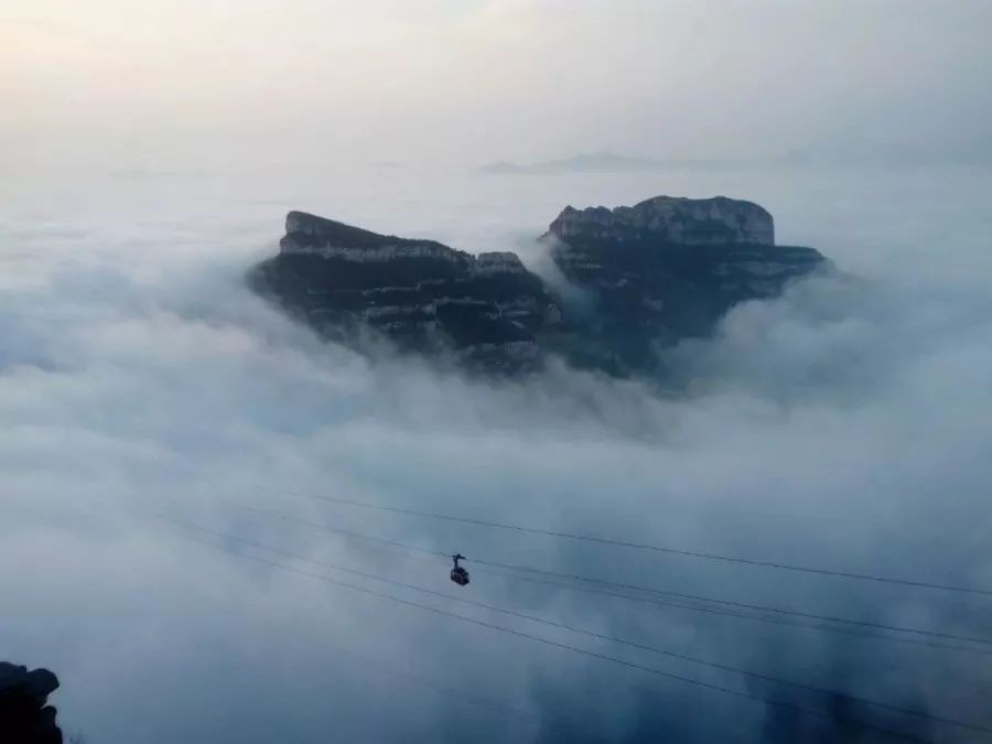 “抱犊晴岚”这一语,最早出现于明代,为获鹿八景的第一景,抱犊寨这一奇观,一般多出现在夏秋两季大雨过后。这时,头顶上是朗日晴空,而幽谷中则是云雾蒸腾,时而如涛似雪,时而倒海翻江。如果你这时刚好乘索道下山,轻便车厢钻入云涛雾海之中,那就名符其实地腾云驾雾了。