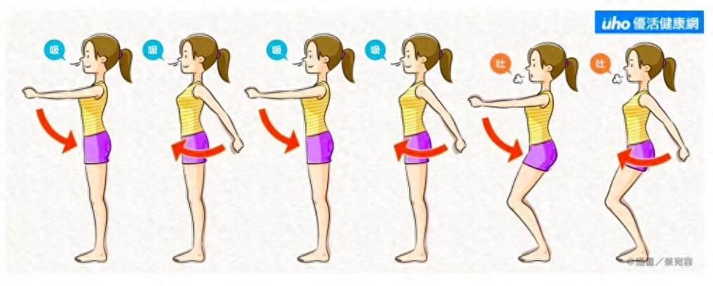 5)双手往下摆时,微微屈膝一蹲,慢慢吐气。