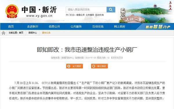 新华网南京7月29日电(杨振 刘宇晴)7月29日上午9:30,央视播出《“去产能”下的小钢厂复产记》的新闻调查,对新沂市瓦窑镇小钢厂违规生产问题进行监督报道。