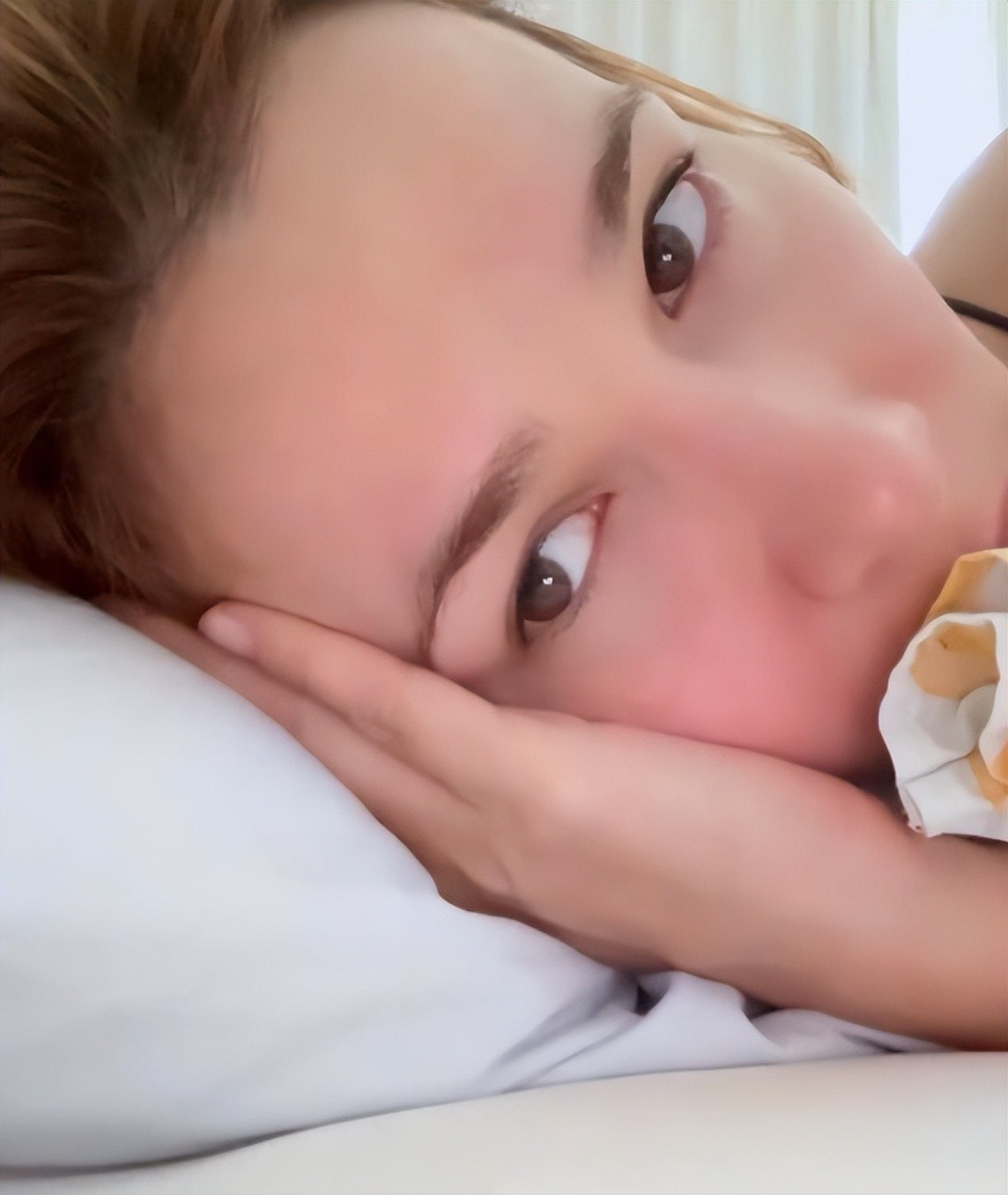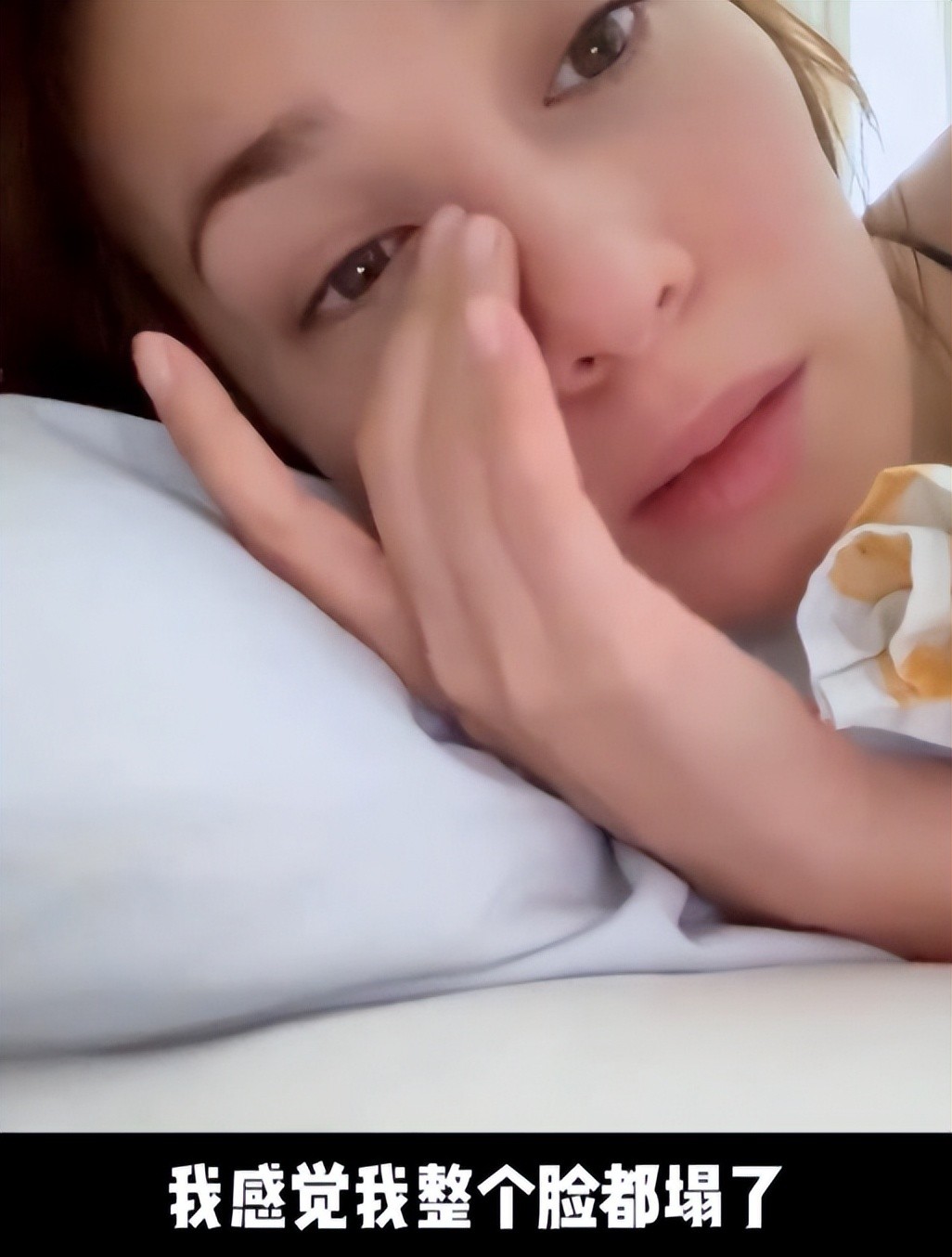画面中卢靖姗的镜头紧挨着脸部,将整张脸的五官细节都给出了特写,因为参加节目的录制连续有3天没能好好睡觉,卢靖姗表示自己很想把皮肤的状态补回来。素颜出镜的卢靖姗,躺在白白的枕头上,白皙光滑的面部肌肤,或许是因为刚睡醒没多久甚至都有些红润,跟普通人的做法相反,卢靖姗似乎完全不怕面部的某些缺陷暴露。