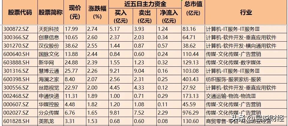 天阳科技(信用卡龙头)、创意信息、汉仪股份(字库龙头)、国脉文化、新华网、慧博云通(数据标注+AI算力)、海澜之家、丝路视觉(数字视觉)、申通快递、华媒控股(融媒体+文创产业+区块链)、分众传媒、美凯龙(家居连锁商场龙头)