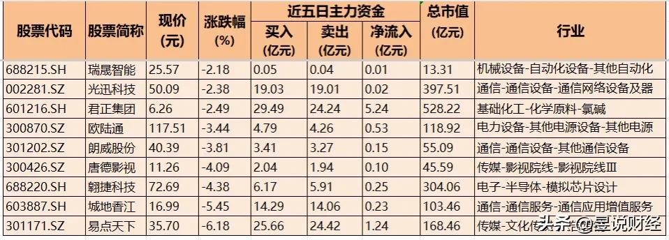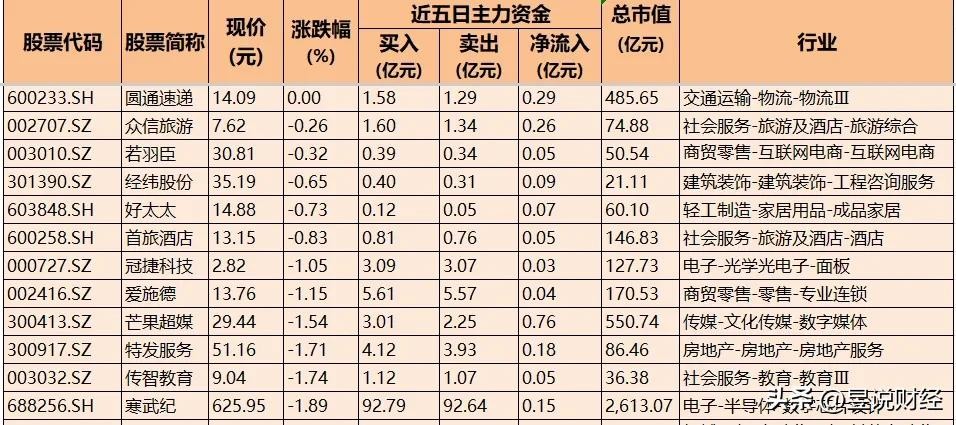 圆通速递(快递龙头)、众信旅游、若羽臣(电商代运营)、经纬股份、好太太(智能家居+晾衣机)、首旅酒店、冠捷科技(全球显示终端制造龙头)、爱施德、芒果超媒(长视频平台龙头)、特发服务、传智教育、寒武纪(AI芯片龙头)