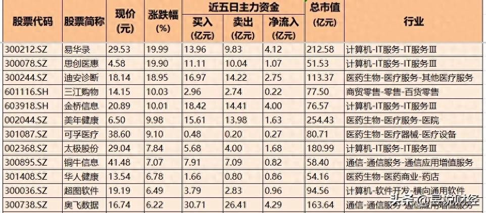 易华录(大数据+存储行业龙头)、思创医惠、迪安诊断(第三方医学检验龙头)、三江购物、金桥信息(智慧 courtroom +信息化建设)、美年健康、可孚医疗(医疗设备龙头)、太极股份、牛信息、华人健康、超图软件(地理信息系统龙头)、奥飞数据(IDC服务)