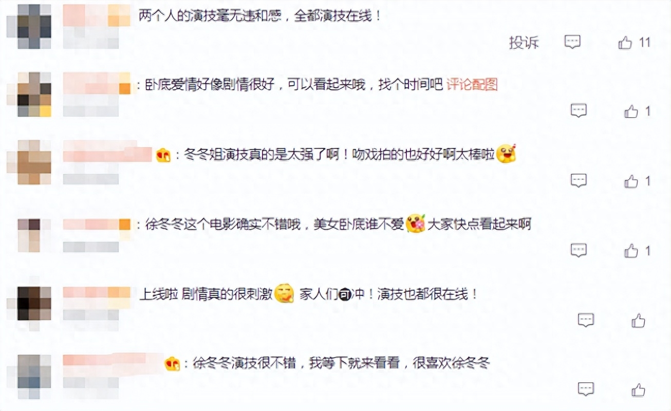网友们对于两人吻戏的片段也是纷纷评论,有人说:两个人的演技毫无违和感,全都演技在线!也有人说:卧底爱情好像剧情很好,可以看起来哦,找个时间吧!甚至还有人说:冬冬姐演技真的是太强了啊!吻戏拍得也好好啊太棒啦!