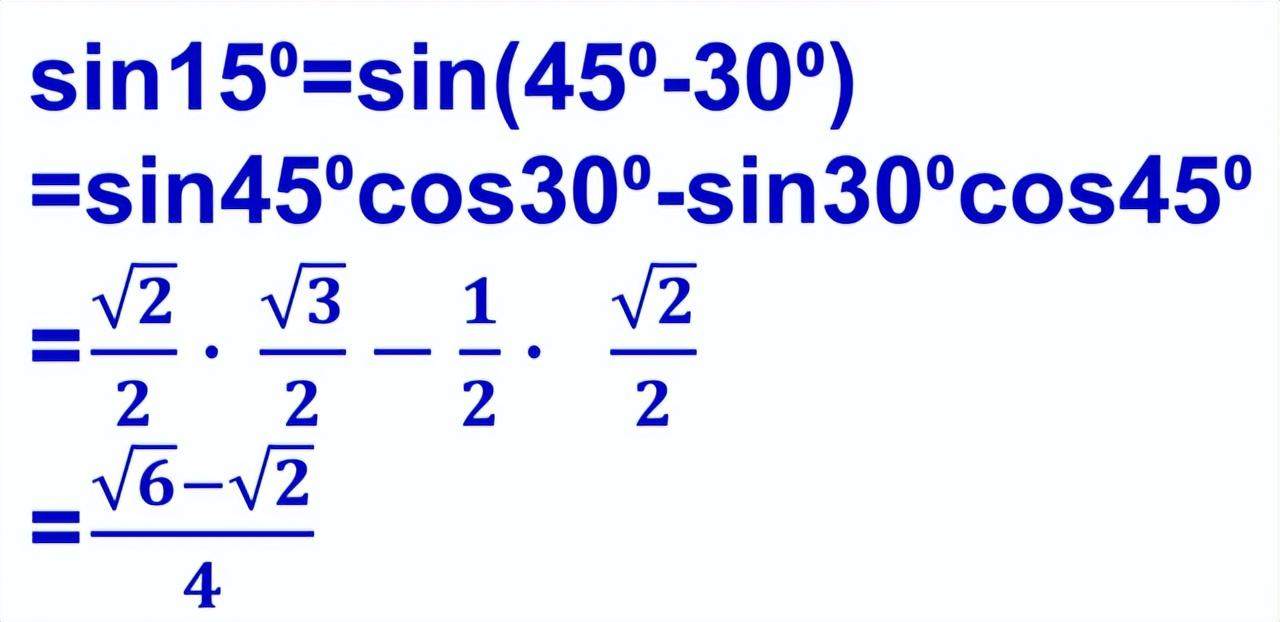 角度差的正弦公式是:sin(x-y)=sinxcosy-sinycosx. 因此我们可以把sin15度写成sin(45度-30度)的形式。那么就有