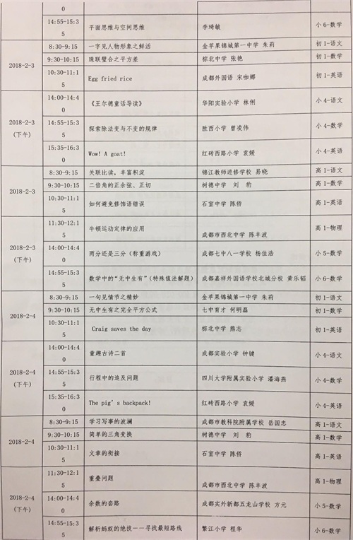 寒假期间,成都数字学校将开设名师在线专题课堂(课程表附后),七中育才、树德中学、成都外国语学校、成都七中、石室联合中学、石室中学、成都市实验小学、泡桐树小学等名校名师将轮番上线,为同学们回顾和梳理各个学科的知识点,以及详解中、高考考点等内容,成都区域学生可免费观看学习。