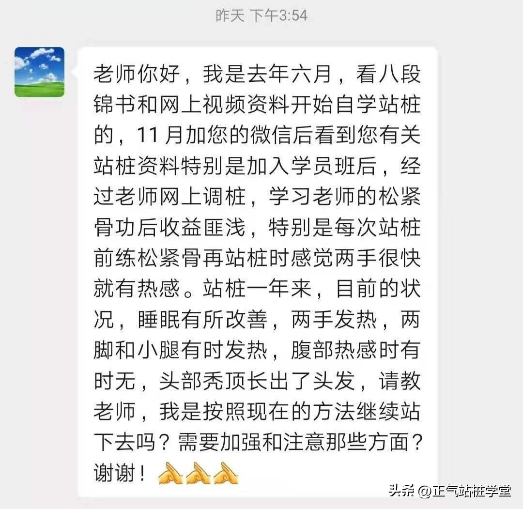 还有一位6旬的会员,说他站桩一年来,睡眠变好,手脚发热,甚至头顶的秃顶也长出头发。