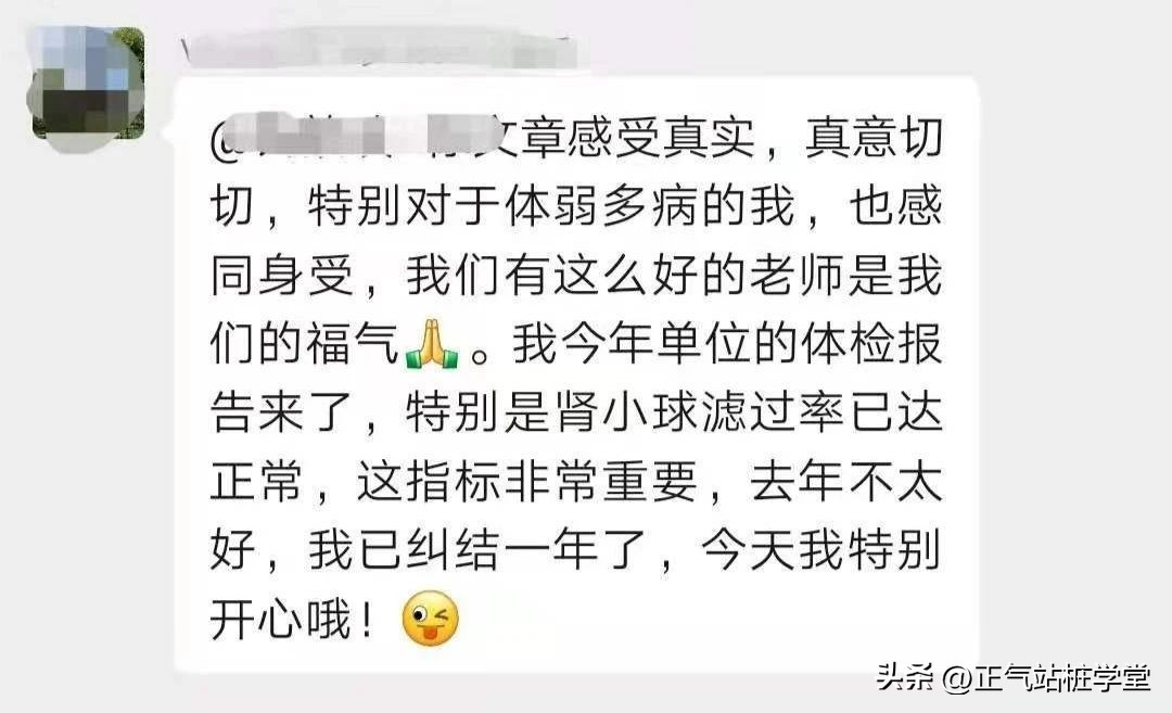 有站桩会员说她站桩一年左右,去体检,结果发现自己纠结一年的肾小球滤过率已正常了,非常开心。