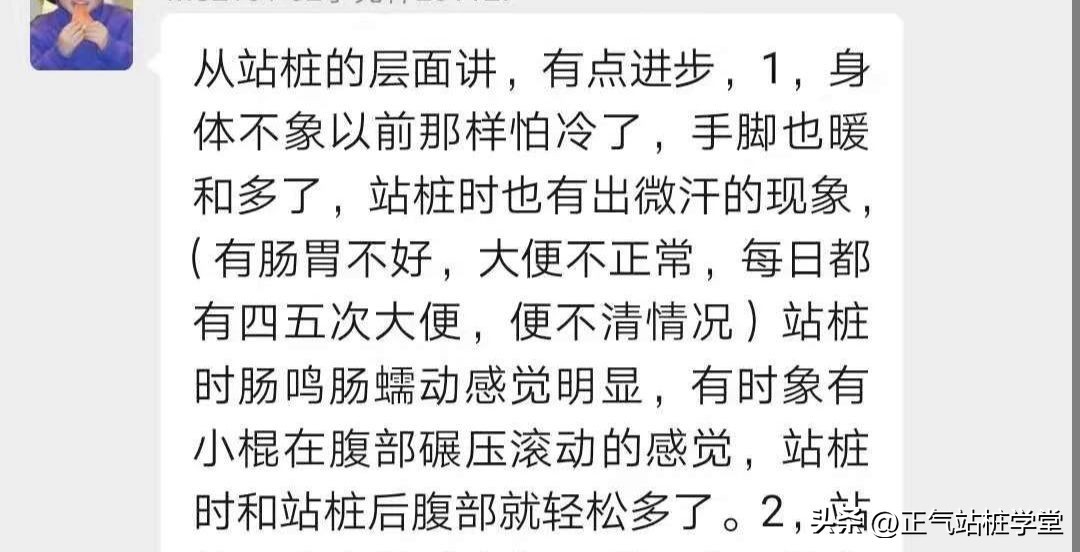 同样6旬的站桩会员,说他站桩后不像以前那么怕冷了,手脚都暖和多了,大便也正常了。(便秘对很多中老年人来说是件很痛苦的事,站桩时由于气血循环的加速,会促进肠道的蠕动,增加肠道津液,逐渐恢复肠道功能。