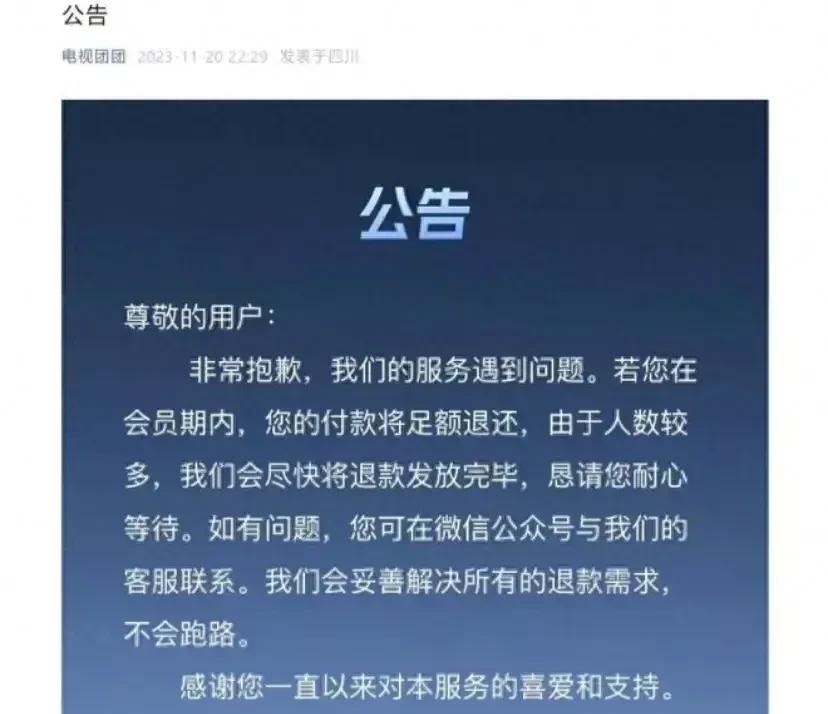 先说说背景。近日,“电视家”突然发布公告称由于种种原因将停止服务。用户们纷纷在社交平台上表达自己的惊讶与失望:“这下周末我该怎么办?”、“‘电视家’跑路了吗?”媒体也不甘示弱,立马展开调查。