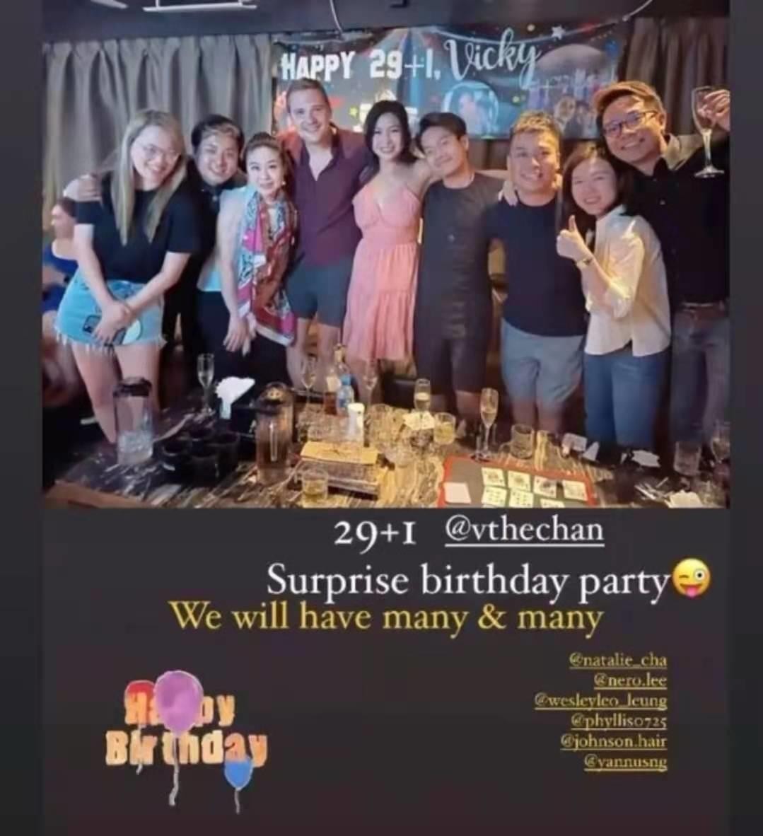 同时在当天的场地布置,从照片中可以清楚地看到背景还写着Vicky“29+1”的横批,在大家的大合照中,也是能够看出当天的大家应该是玩得很开心的。