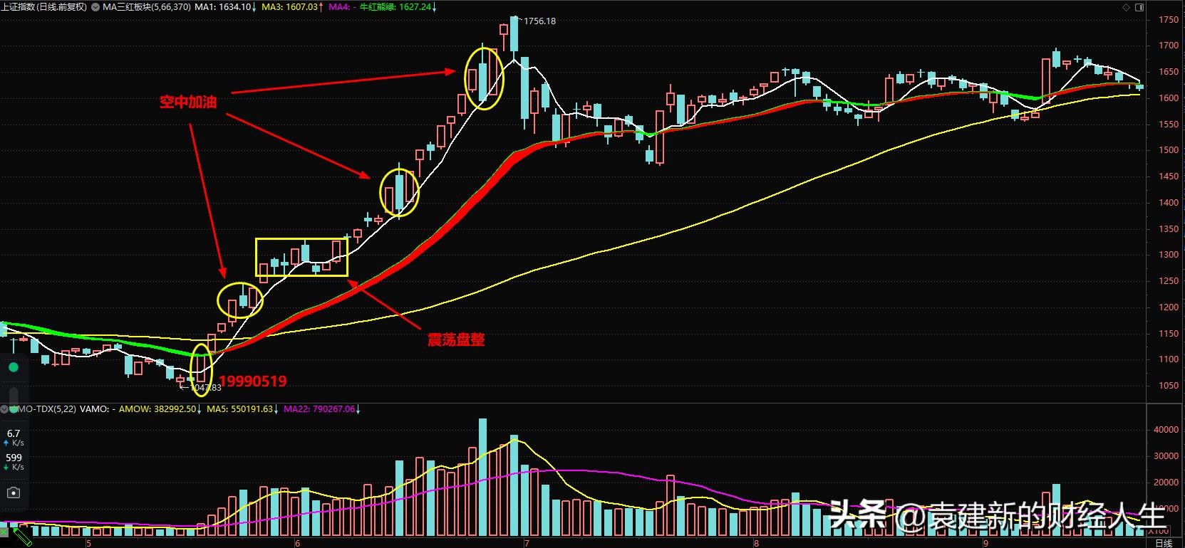 以519为例,从99年5月19日1059点开始大涨,到7月1日最高1756点,第一波才结束。此后经过55个交易日,期间最低1471点,最后冲击到1695点体力不支,一路下行,此后再创新高到2114点已经是2000年8月了。历经了一次震荡盘整和三次空中加油,直到最后一次空中加油K仙组合被打穿,才见顶。有鉴于此,所有空中加油和震荡盘整都是加仓的机会,不妨等到空中加油或盘整震荡区间被打穿再考虑清仓!