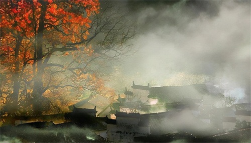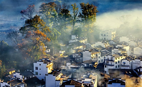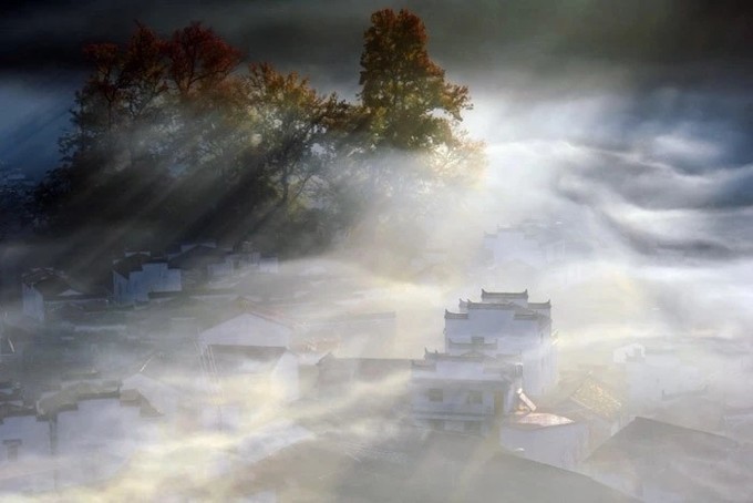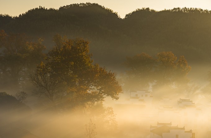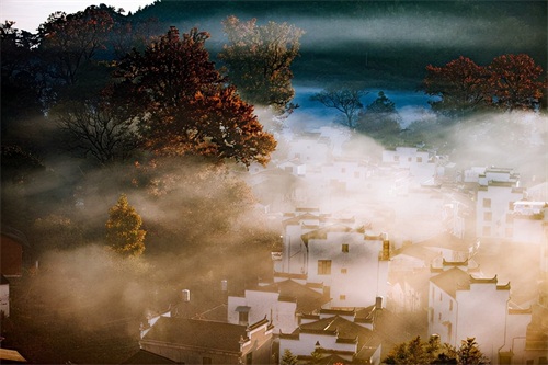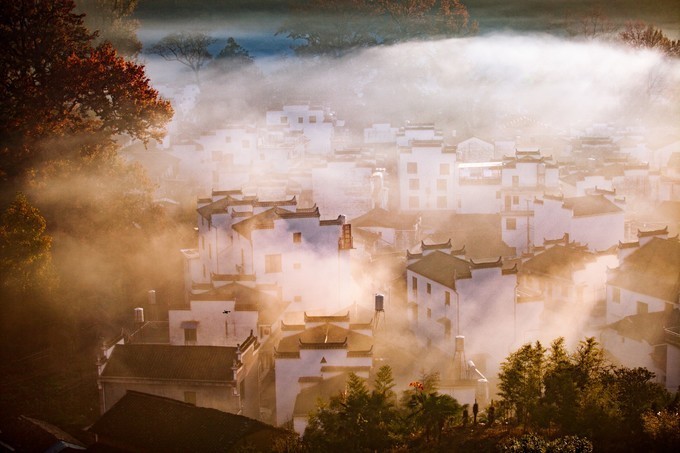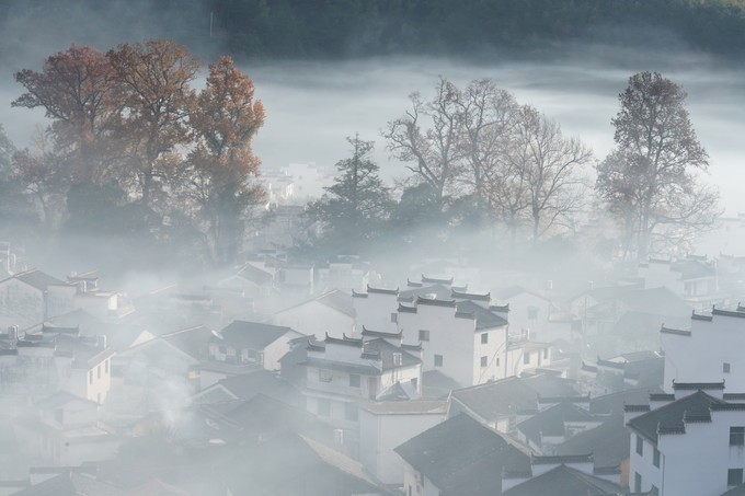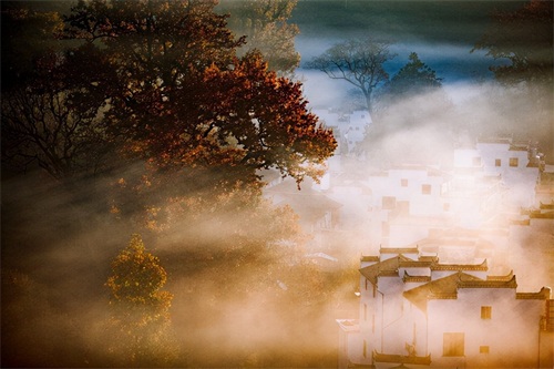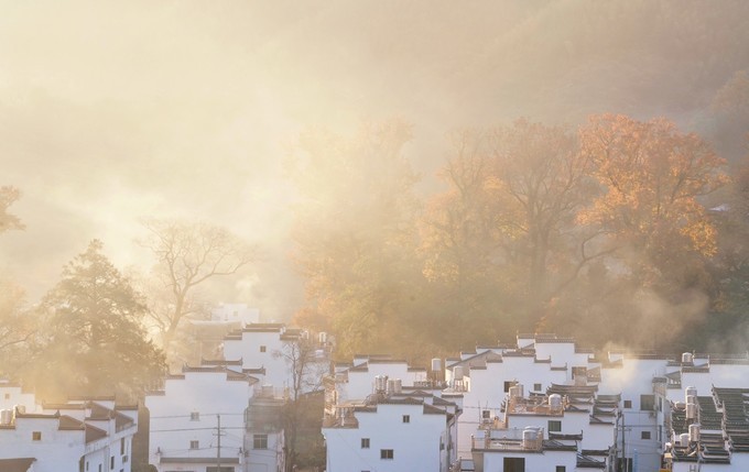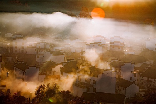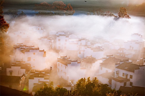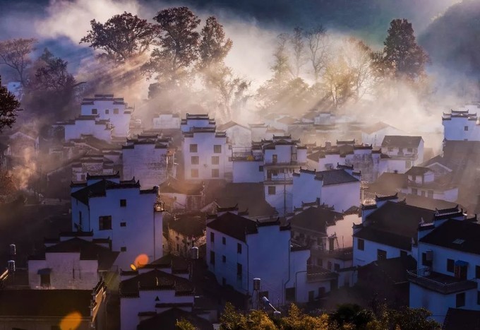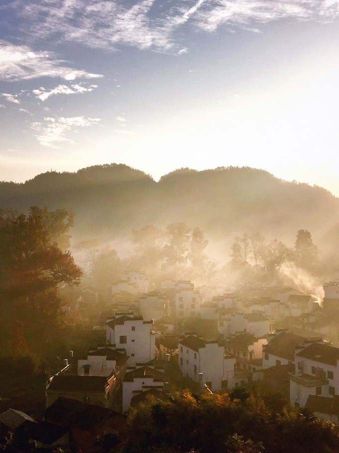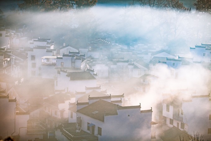 当太阳升起,浓雾开始逐渐散开,远处的蓝天出现,白墙瓦黛上余留着薄薄的雾气,一幅油墨画就这样子诞生在了眼前。