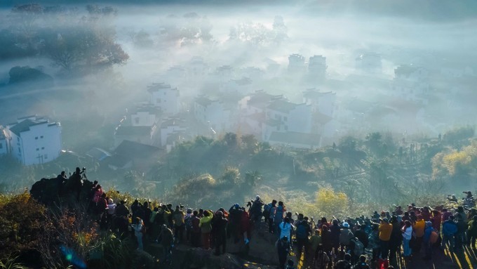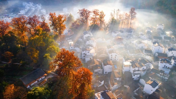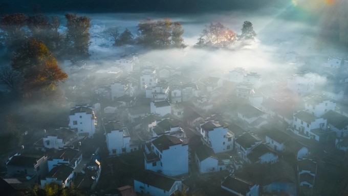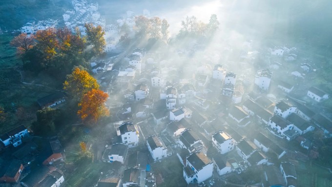 婺源石城|云雾缭绕之境,晨光中的徽式古村落,中国画里的深秋