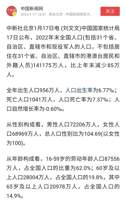 1月17日,国务院新闻办举行2022年国民经济运行情况新闻发布会介绍,2022年,中国全年出生人口跌破1000万大关,共计956万人。出生数量低于全年死亡人口,共计1041万人。人口自然增长率由正转负,报-0.60‰,全国人口较上年减少85万人。