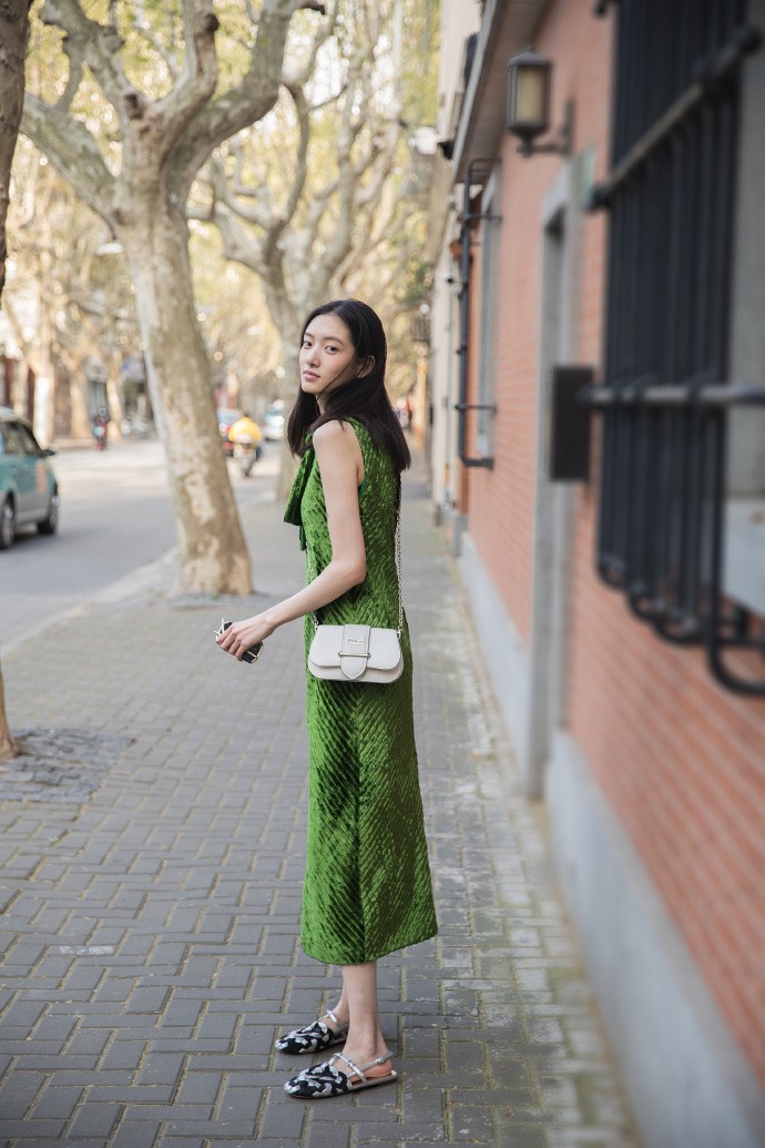 项偞婧穿搭很简单,淡淡的裸妆加上自然的发色,却总能呈现出一种高级感。斜纹的墨绿色无袖连衣裙具有一种厚实的质感,直筒修身的版型很适合项偞婧这样苗条的身材,搭配白色单肩斜挎包和黑色印花平底鞋,色彩清新又干净舒适。