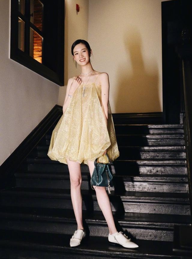 气质清冷自带仙气是项偞婧特点,白皙的皮肤和充满了骨感美的身材,让她对单品的驾驭度也很高。一字肩的纱质蓬蓬裙虽然甜美可爱,但一不小心就会穿出孕妇装的既视感,搭配上墨绿色手提包和尖头皮鞋,平添性感意味。