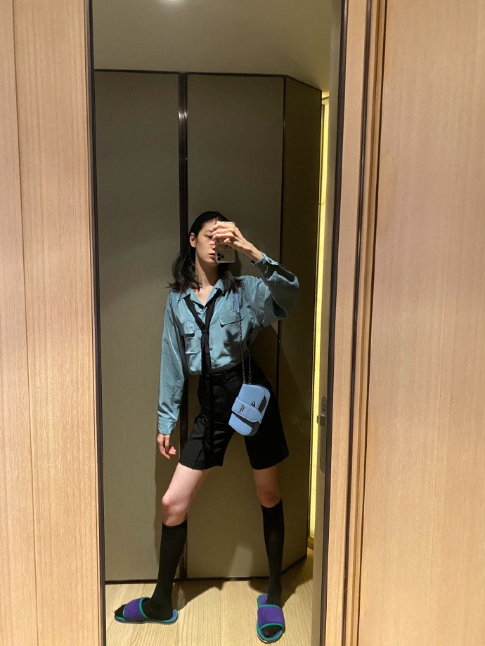 裙装柔美,裤装中性帅气,换身穿搭的项偞婧能够很快展现出衣服本身的风格特点。湖蓝色工装衬衫用黑色领带作为装饰,既增添了单品的设计感,又和短裤的色彩相呼应,让简单的搭配更加显得青春减龄。