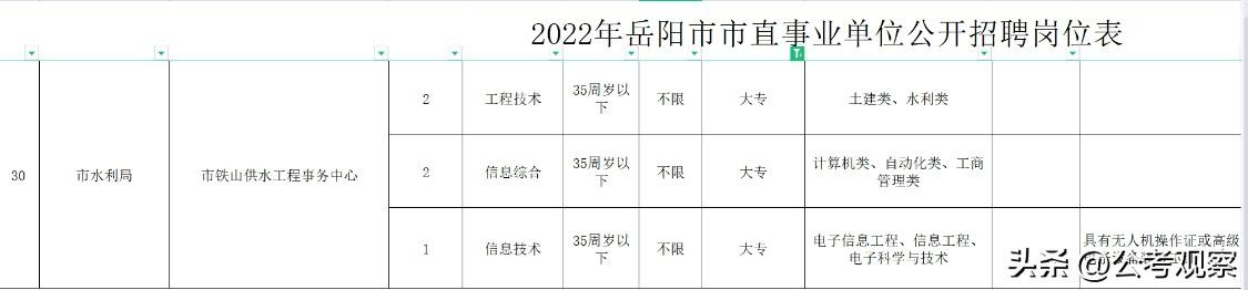 大专也能报考水利单位,如岳阳市市直事业单位公开招聘岗位表中,市水利局的市铁山供水工程事务中心,对于报考者的学历要求就是大专。