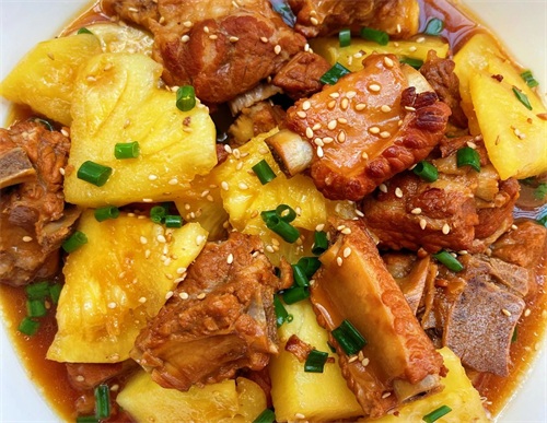 【食材】:排骨1000g,菠萝半个,冰糖适量,姜片