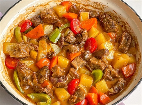 【食材】牛腩800g|土豆2个|胡萝卜1根|洋葱1个|青椒1个|小番茄|大蒜|1664白啤1瓶|浓汤宝|黄油|番茄酱3勺|面粉2勺|香叶2片|黑胡椒