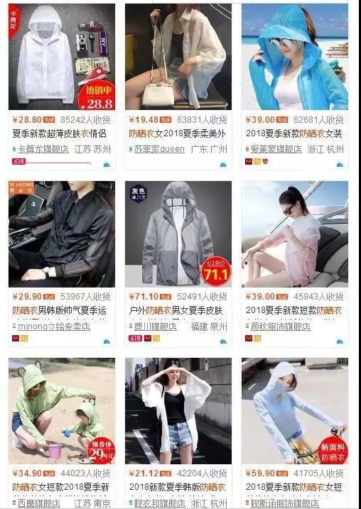 不搜不知道,一搜吓一跳。网上的各式防晒服,可谓是品种多样,价格也是从19到999元不等。店家们纷纷声称,这种衣服采用了“超薄透气防晒面料”,具有高分值的“紫外线防护系数UPF”。