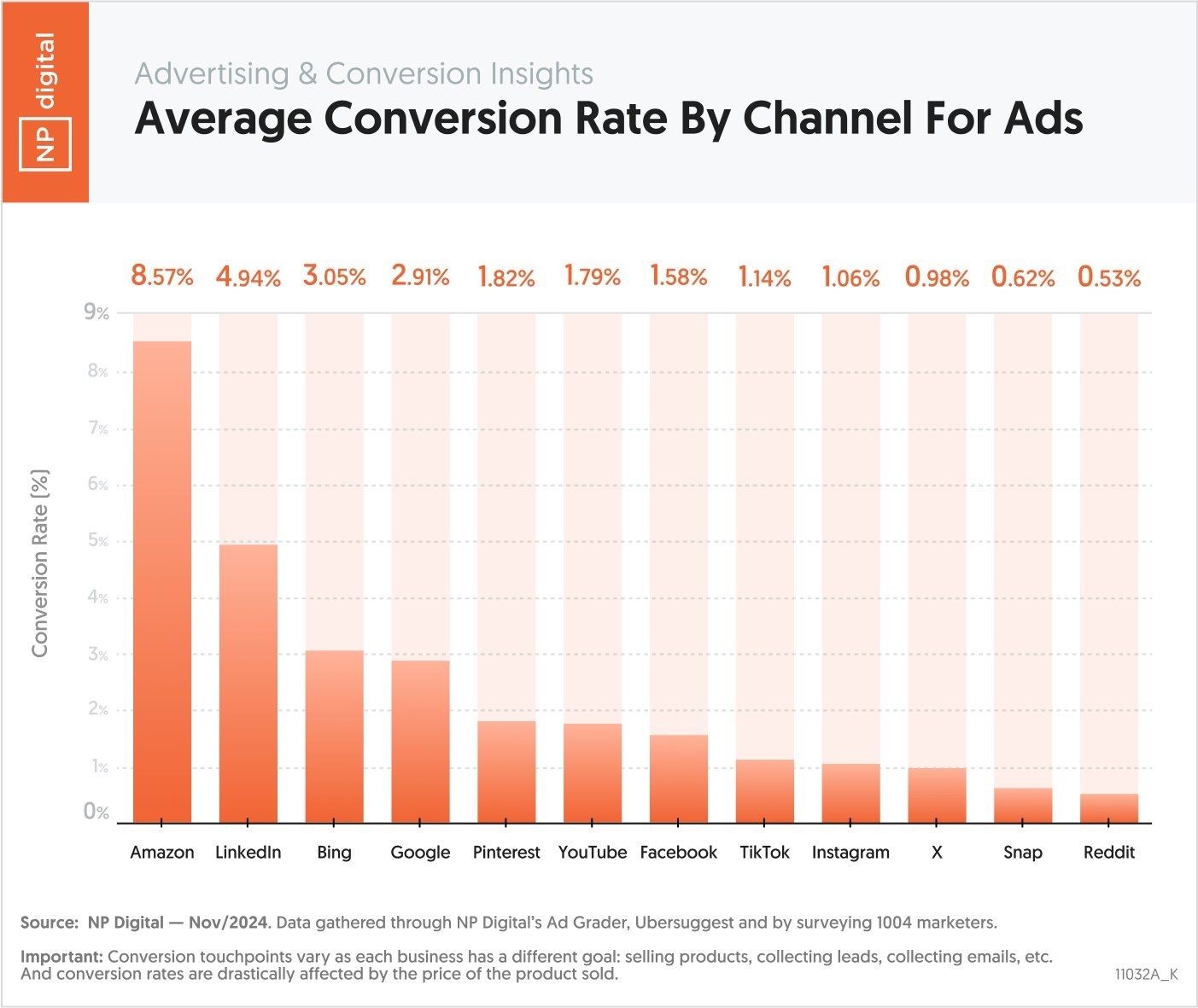 60. 亚马逊广告具有最高平均转化率(8.57%). LinkedIn在第二(4.94%),同时必应涉及在第三(3.05%). ( NP数字 )