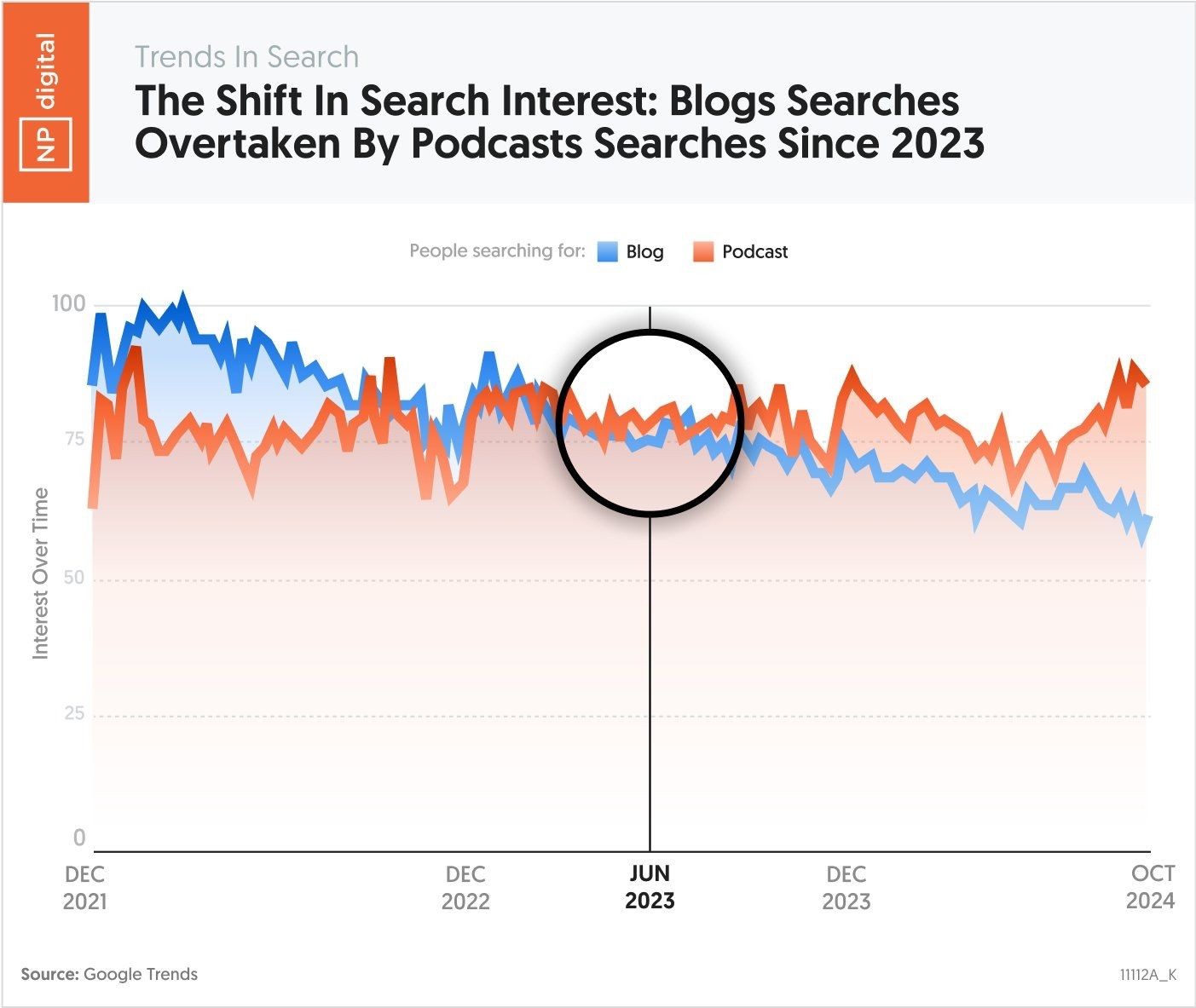 43. 播客的搜索超越博客的搜索,在六月2023年。 由于播客继续吸引更多的兴趣,因为有很少的播客,比博客(4.3亿美元和1亿美元),他们本的明智投资对于很多品牌。 ( NP数字 )