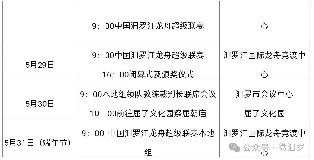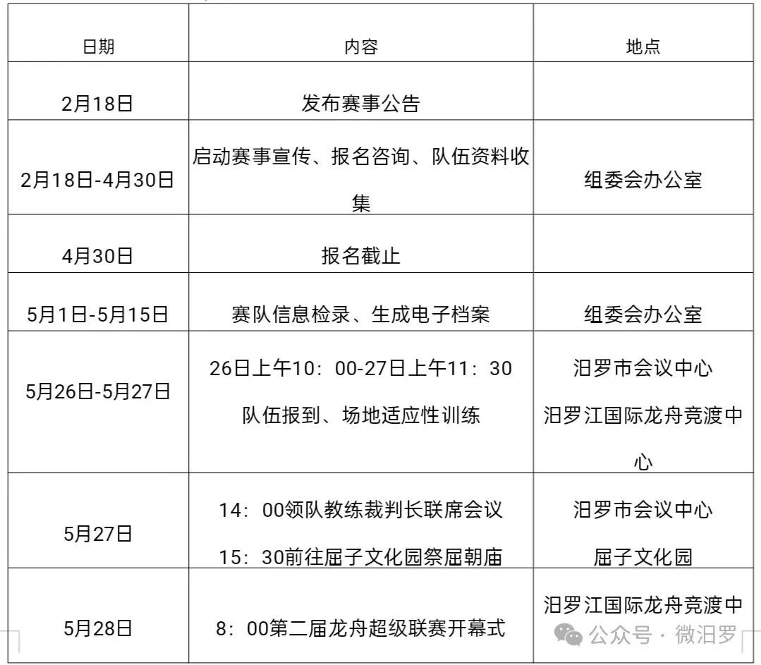 为弘扬中华传统文化,加强龙舟文化交流,多方位展示汨罗作为“端午源头 龙舟故里 诗歌原乡”的城市形象,进一步强化“中国汨罗江龙舟超级联赛”品牌,根据湖南省第四届旅游发展大会的总体部署,由中共汨罗市委、市人民政府主办,汨罗市文旅集团、市龙舟协会承办的“2025第二届中国汨罗江龙舟超级联赛”将于2025年5月26日至5月31日在汨罗江国际龙舟竞渡中心举行。现将《2025第二届中国汨罗江龙舟超级联赛竞赛规程》向社会发布,请各单位积极宣传,做好龙舟队伍的组织、报名、训练等相关准备工作,并加强对龙舟队伍的组织领导与安全管理,争取在比赛中取得优异成绩。